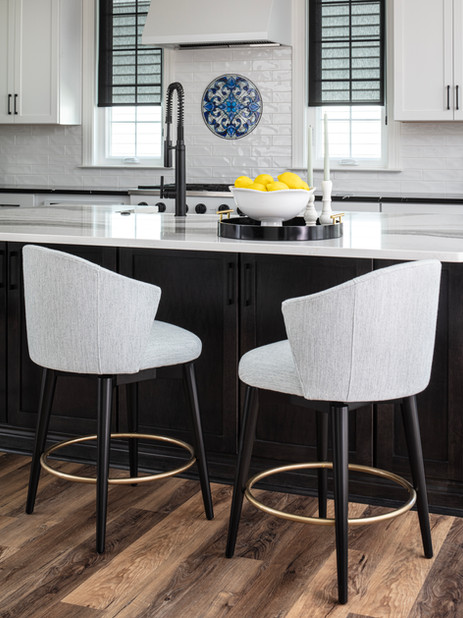 We swapped out the existing counter stools (from their previous home) for a fresh look in a performance fabric. The high contrast between the swivel stools and the island really make them pop while also fitting right in with the rest of the kitchen. For a bit of color, we added a unique stained glass piece above the cooktop and filled the accent bowl with lifelike lemons.