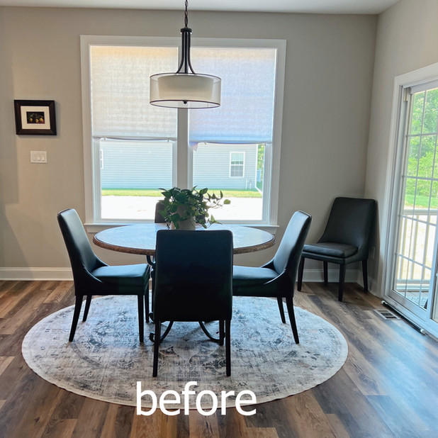 We added fresh window treatments near the table, to coordinate with the existing area rug our clients wanted to keep. We brought in a larger table to fit all 5 chairs and added textured pottery into the space. We love how the brass details on the table legs compliment the stool foot rests and the centerpiece trays.